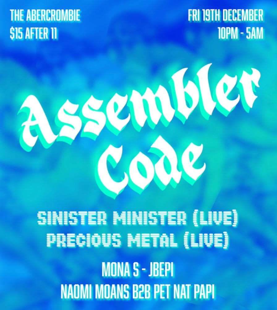 Returning to The Abercrombie for one last time in 2025, Assembler Code & Friends are taking over the club on Fri Dec 19th for an evening of electro, EBM, techno and more. Sinister Minister will be bringing his mad scientist like live techno rig to the Function One Sound System for the first time, Precious Metal will once again surprise and delight with his gymnastic brand of acid pop and DJs Mona S, Jbepi, and Naomi Moans b2b Pet Nat Papi will bring the heat to your dancing feat.