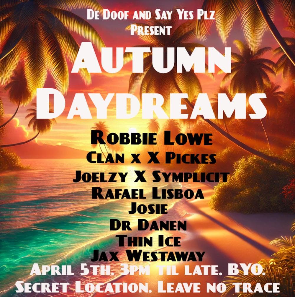 We throwing another Beach Party! April 5th, BYO, secret location (not too far from the CBD). Got an awesome line up! Robbie Lowe, Clan X, Pickles, Joelzy, Symplicit Sounds, Rafael Lisboa, Josie, Dr Danen, Thin Ice, Jax Westaway. Location to be released the night before. Bring ur swimmers if u wanna get wet. Dress fancy if u feel like it. 3pm till late (probs midnight). Please leave not trace.