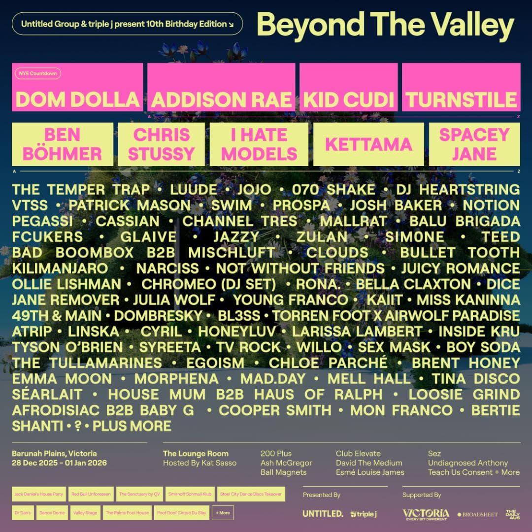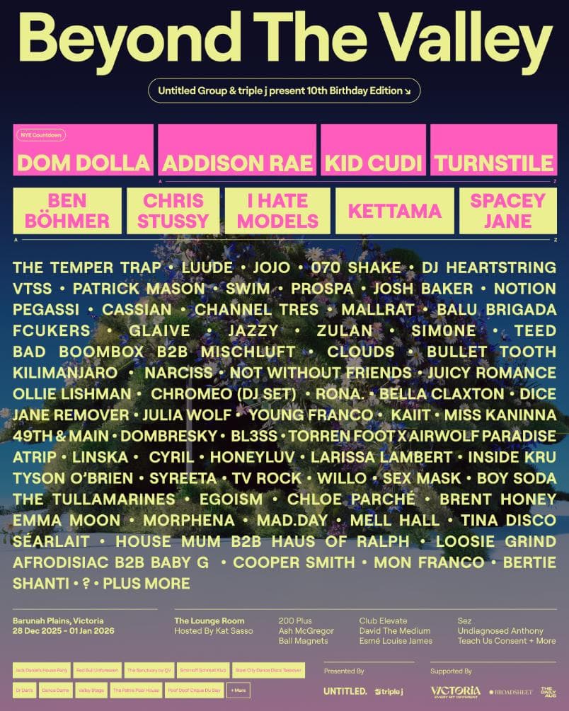 This year’s lineup is one of the biggest in BTV history, headlined by global dance music powerhouse Dom Dolla (NYE countdown), pop culture phenomenon Addison Rae, pioneering hip-hop visionary Kid Cudi, and genre-defying punk icons Turnstile. They’ll be joined by Spacey Jane, I Hate Models, KETTAMA, Chris Stussy, Ben Böhmer, The Temper Trap, Luude, JoJo, 070 Shake, DJ HEARTSTRING, VTSS, Patrick Mason, SWIM, Prospa, Channel Tres, Mallrat, Balu Brigada, Fcukers, Jane Remover, Kaiit, Miss Kaninna and many more.