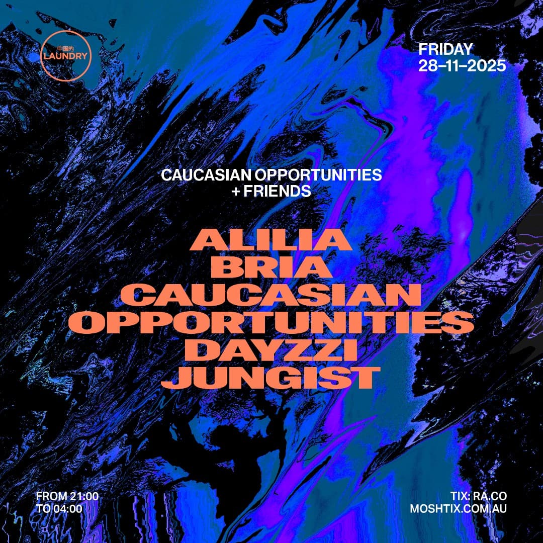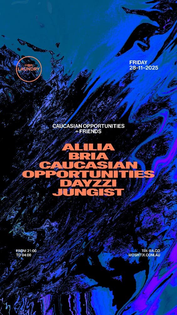 CaucasianOpportunities touches down in Sydney taking over the legendary Chinese Laundry for a full-floor reset. The night pulls together Bria’s fast and percussive club mutations, Jungist’s warped bass and hard groove selections, Dayzzi’s euphoric trance and techno blends, Alilia’s razor-edged rhythm experiments, a cross-section of artists pushing their own frequencies forward.