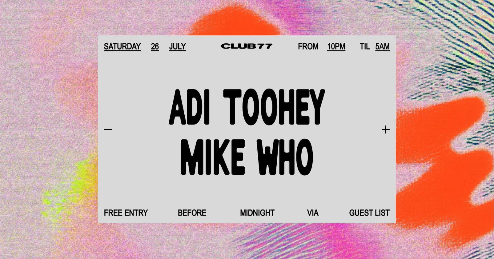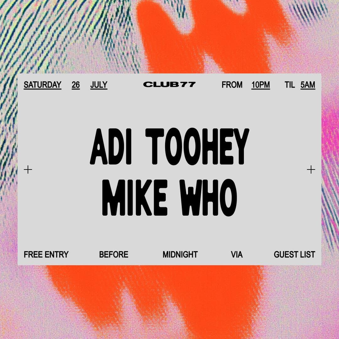 Event info & guest list here: https://www.club77.com.au/events/club-77-adi-toohey-mike-who