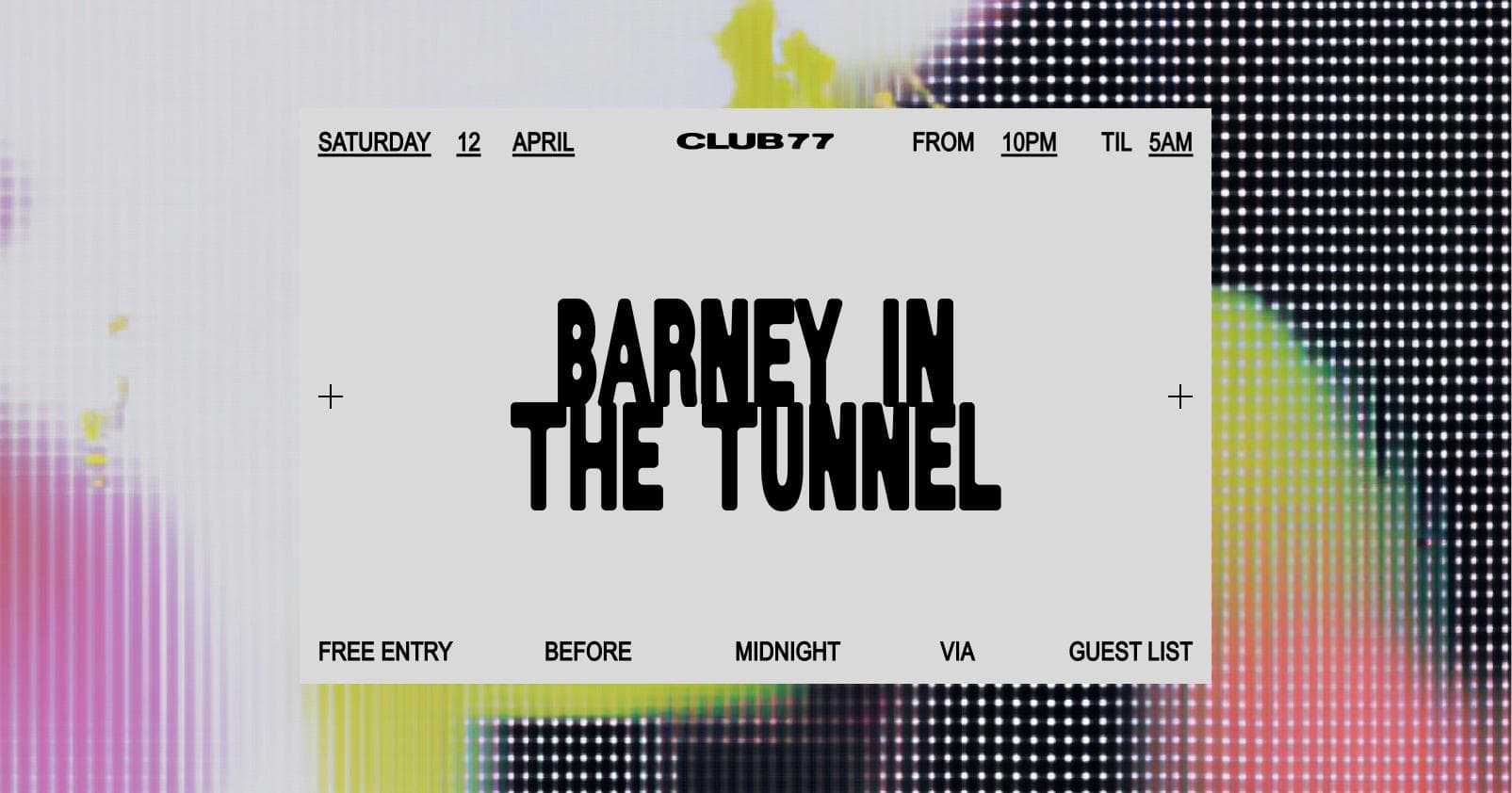 Event info & guest list here: https://www.club77.com.au/events/club-77-barney-in-the-tunnel