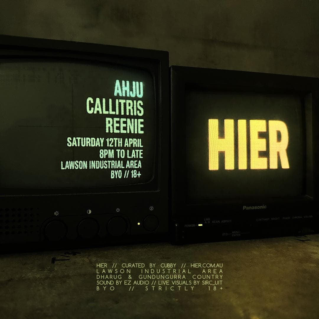 HIER is an ongoing collaboration between Dharug & Gundungurra based label CUBBY and SIRC_UIT, taking place at a permanent location in the Lawson Industrial Area. HIER’s aim is to expose audiences to a diverse line-up of established and emerging electronic music producers and DJs from Eora and beyond, playing amongst an ever-evolving immersive light installation and a purpose-built PA system by EZ Audio.
