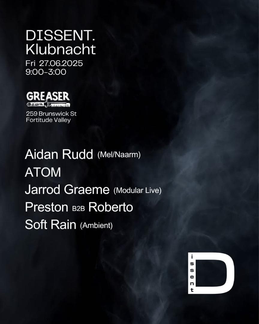 Dissent Klubnacht returns this month to the dark and sweaty Greaser garage with another heavy weight Techno lineup. We are excited to bring Brisbane alumnus Aidan Rudd back home for the ride. Aidan, now based in Naarm/Melbourne, has been making waves internationally with his heavy and dark brand of groovy techno. A favourite producer of titans in techno like Funk Assault and Future 666, Aidan’s tracks are played regularly the biggest events in Europe.