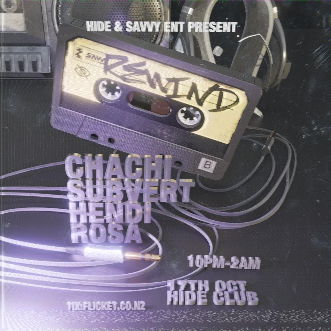 Step back in time with Rewind – a night dedicated to the sounds, selectors, and energy that defined the Christchurch Drum & Bass scene a decade ago. This special edition brings back some of the names who shaped the era, delivering a throwback to the raw, rolling, and high-energy sets that lit up dancefloors all over the city. Expect a night of nostalgia, heavy-hitting anthems, and timeless selections from the legends CHACHI, SUBVERT, ROSA and HENDI.