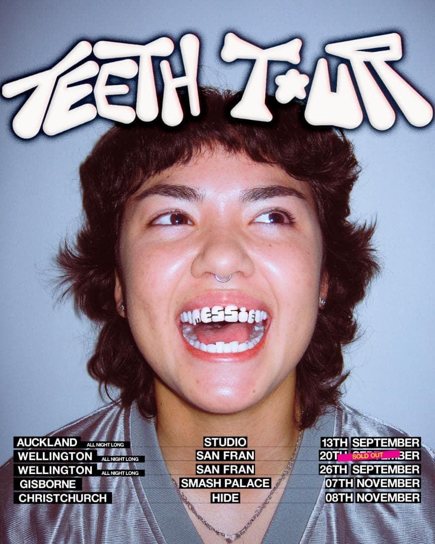 Audiences will be able to enjoy MESSIE’s high-energy, electrifying All Night Long sets in Auckland and Wellington until the early hours of the morning. Saturday, 13 September, will see her take over Auckland’s Studio the Venue, before heading to Wellington’s San Fran the following Saturday, for a sold-out show on 20 September. She’ll return for a second San Fran show on Friday, 26 September, before continuing the TEETH TOUR at Gisborne’s Smash Palace on Friday, 7 November, and Christchurch’s Hide Club on Saturday, 8 November.