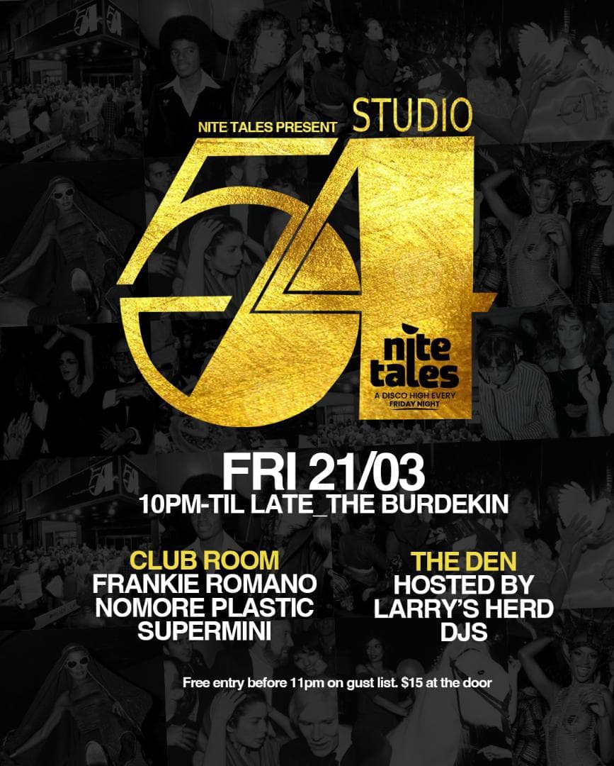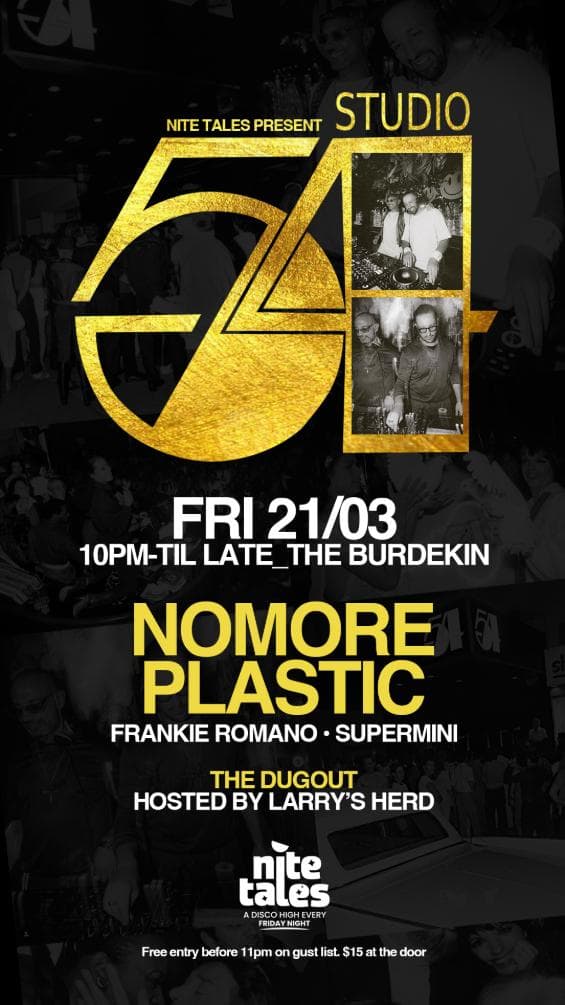 Nite Tales residents Frankie Romano and Supermini will be spinning all your favourite house & classic. Plus, the dons of the Sydney Disco scene and founders of Back To Boogie Wonderland NoMore Plastic join us in the Club Room.