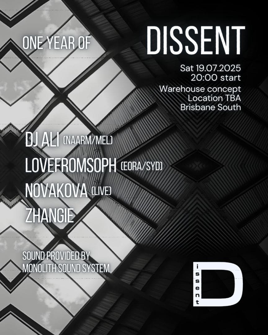 Dissent has just turned 1! To celebrate our first birthday, we are bringing our first warehouse concept with unique lighting installations, featuring two interstate talents DJ Ali (Naarm) and Lovefromsoph (Eora), supported by local favourites Novakova and Zhangie.