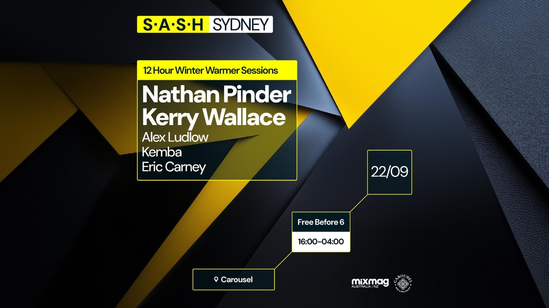 To continue our reunited theme, our very own Kemba will take control of the spaceship and steer it into the early hours of the morning to close out the night. Another recent trip overseas will see him return to our shores with a lust for powerful groove. Audio aficionado Alex Ludlow comes back to Carousel for another stint in the red room, and Eric Carney steps up to deliver some proper deep rollers for his S.A.S.H debut.