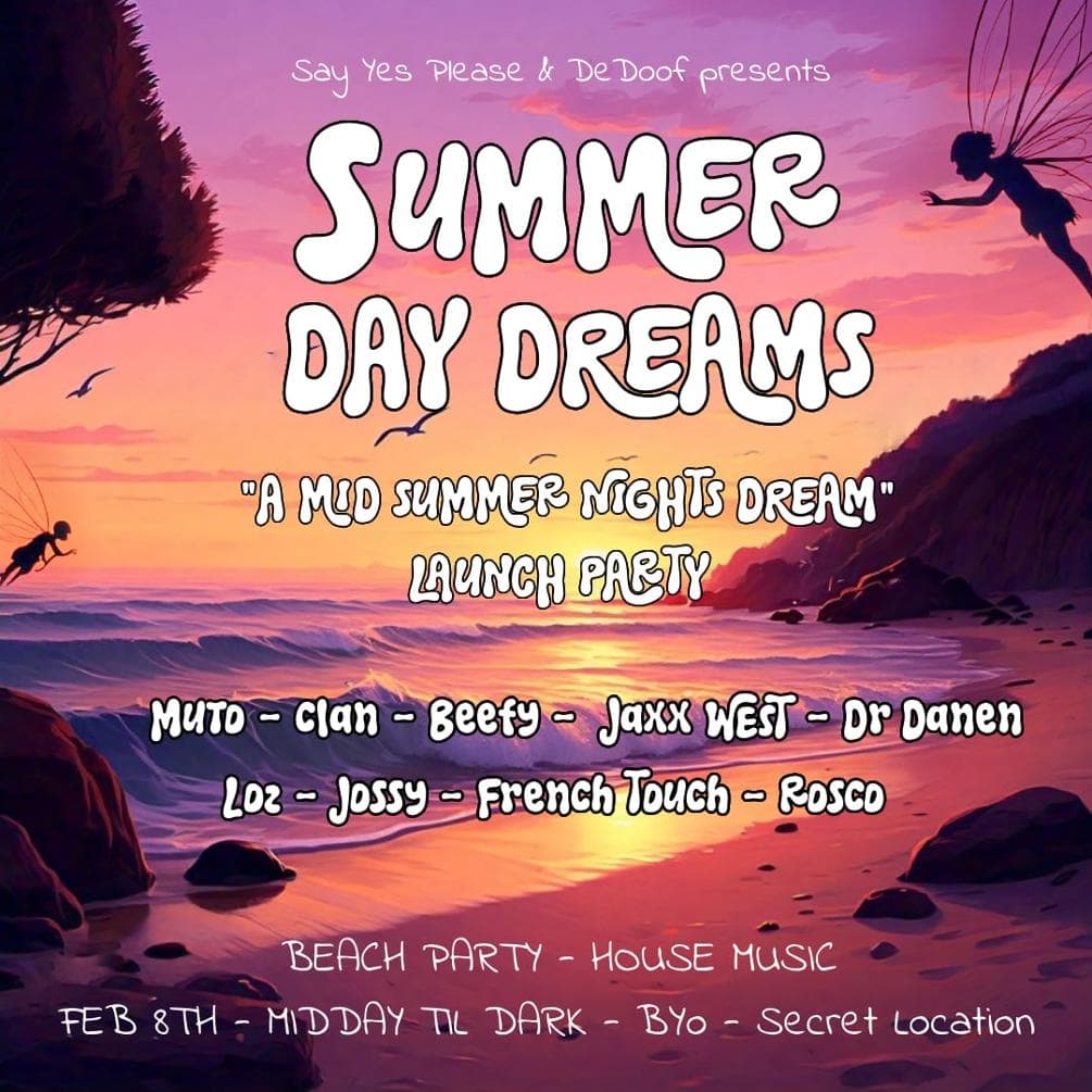 We're throwing a launch party to build hype and raise some funds for De Doof's "A Midsummer Night's Dream" 3 day music festival 21st-23rd of March. Including a bunch of De Doof DJs as well as Muto straight off the plane from LA, we gunna boogie to House music from Midday till Sundown, and maybe carry on a while in the dark if the vibe is right. Bring ur swimmers, towel, food and drinks, BYO everything. Maybe some dry clothes if u wanna keep going after the sun goes down. Location will be released on the morning of the party. All profits are going towards making the March event as dope as possible, including a function one sound system! Yew!
