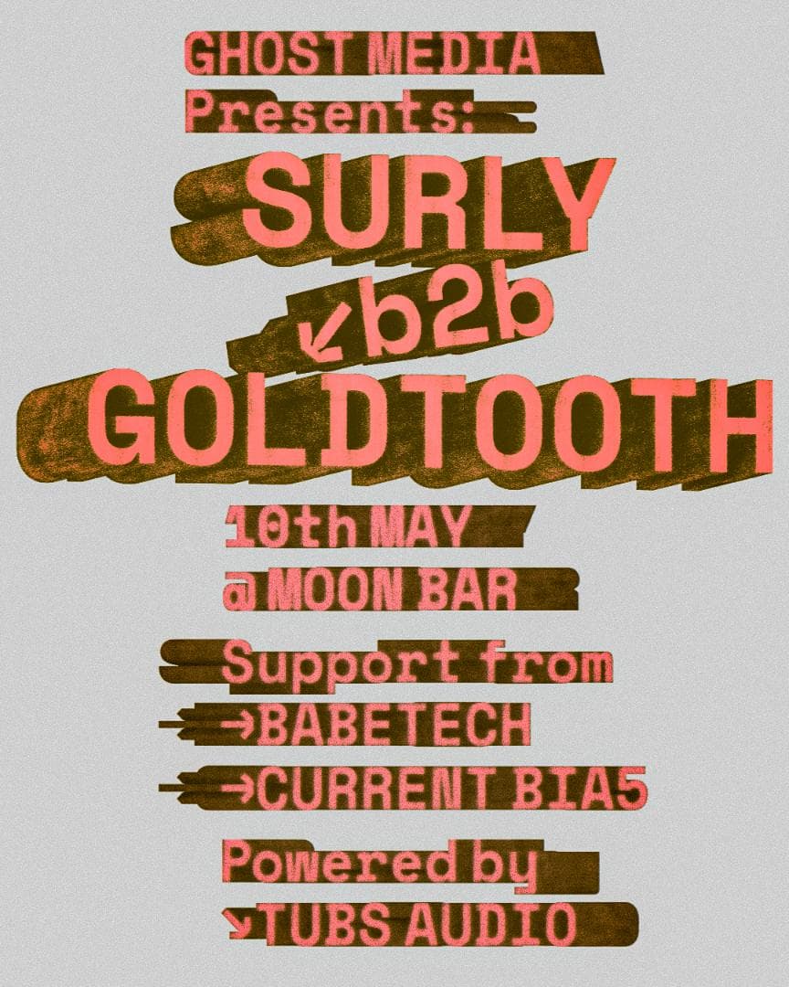 Following up from their legendary b2b at Cuba Dupa this year, we're delighted and excited to welcome SURLY and GOLDTOOTH back to the capital for a 3-hour back to back set covering a broad range of genres and sounds, from house and techno through to grime and footwork, and we're not sure what else in between.