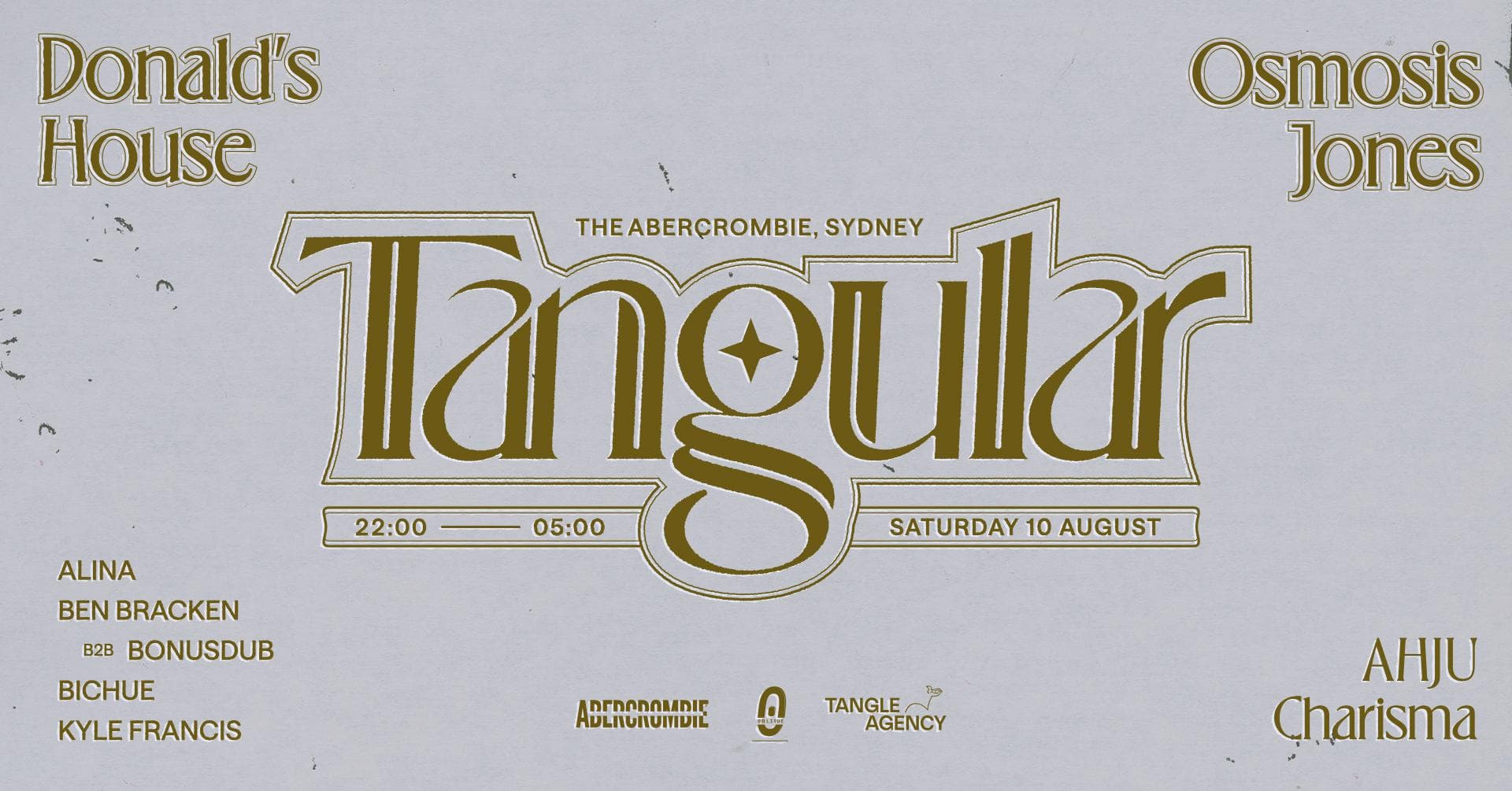 Tangle Agency presents Tangular, a double-header club showcase at The Abercrombie Hotel on Saturday August 10th for all things tech-house, progressive and UKG, with the second room programmed by Oblique Records. Featuring Naarm based Tangle Agency DJs Donald’s House, Osmosis Jones and Charisma, alongside Eora locals Alina, AHJU, Bichue, Kyle Fransis & Oblique DJs.