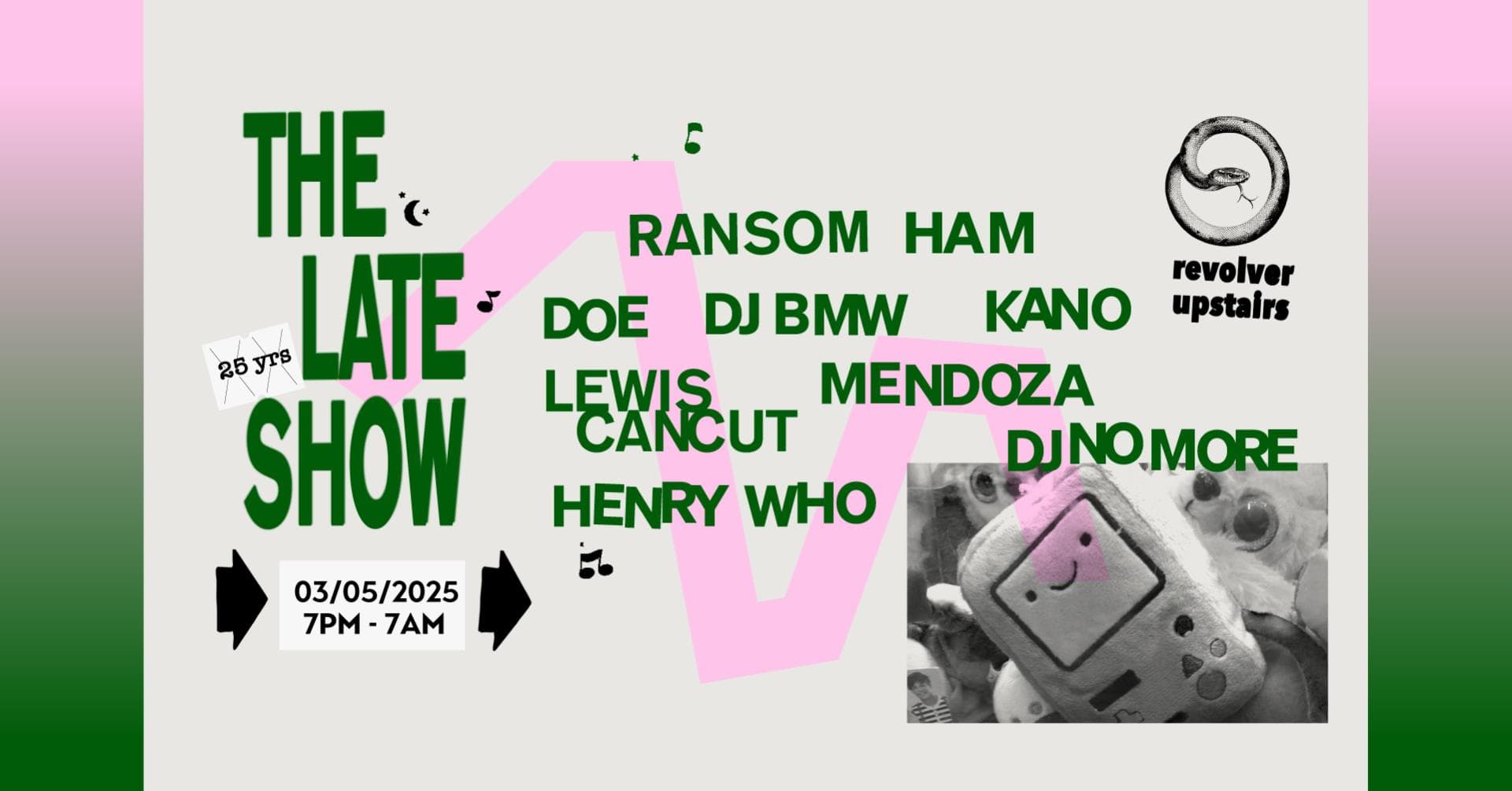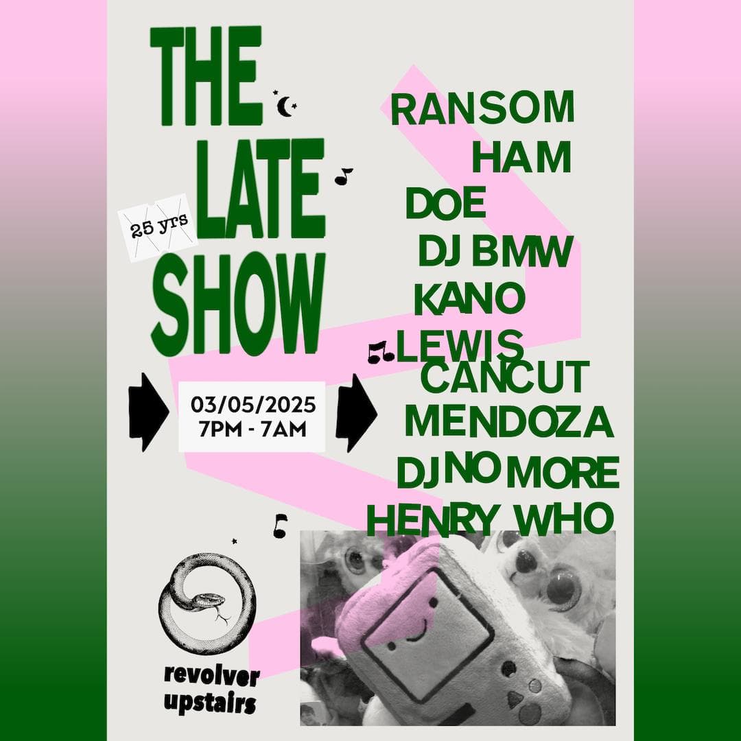 The Late Show is Revolver’s weekly Saturday night. Spread over two rooms, the night begins with Colonel Tan’s restaurant, then gathers pace around 10pm. In the front room, a barrage of Garage, Bassline, Techno and Qgom is shelled down; while in the back-bar, DJ’s splice together House with layers of Italo, Soca and Afro. Residents Ransom, Lewis CanCut and guests plus Boogs from 7am Sunday.