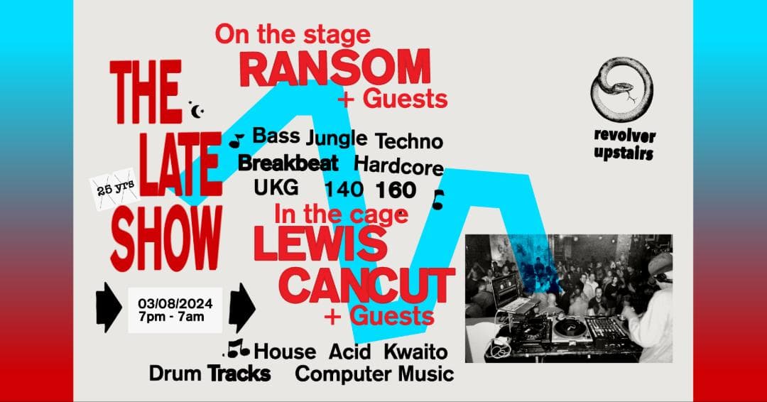 The Late Show is Revolver’s weekly Saturday night. Spread over two rooms, the night begins with Colonel Tan’s restaurant, then gathers pace around 10pm. In the front room, a barrage of Garage, Bassline, Techno and Qgom is shelled down; while in the back-bar, DJ’s splice together House with layers of Italo, Soca and Afro. Residents Ransom, Lewis CanCut and guests plus Boogs from 7am Sunday.