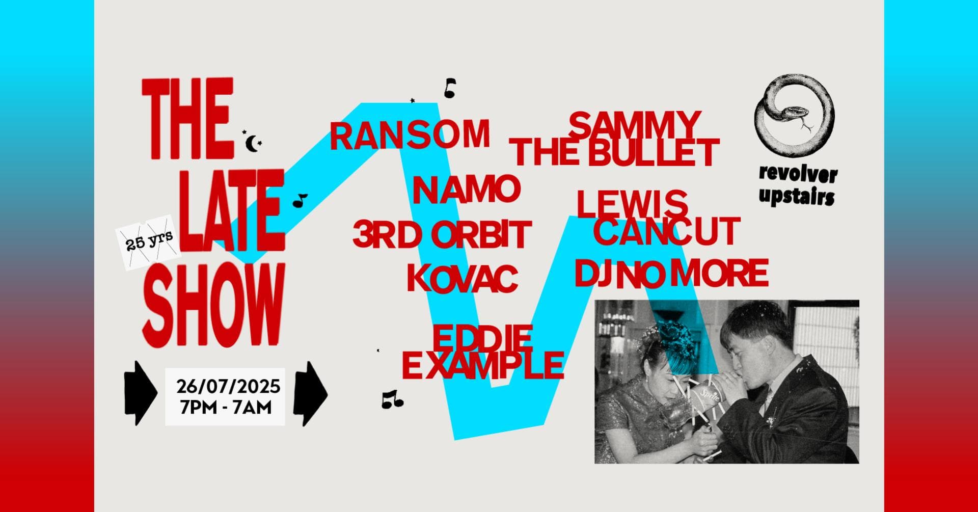 The Late Show is Revolver’s weekly Saturday night. Spread over two rooms, the night begins with Colonel Tan’s restaurant, then gathers pace around 10pm. In the front room, a barrage of Garage, Bassline, Techno and Qgom is shelled down; while in the back-bar, DJ’s splice together House with layers of Italo, Soca and Afro. Residents Ransom, Lewis CanCut and guests plus Boogs from 7am Sunday.