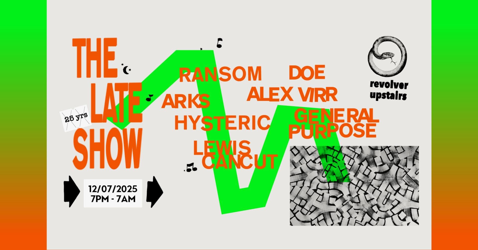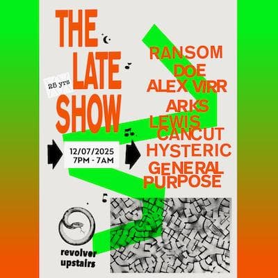 The Late Show is Revolver’s weekly Saturday night. Spread over two rooms, the night begins with Colonel Tan’s restaurant, then gathers pace around 10pm. In the front room, a barrage of Garage, Bassline, Techno and Qgom is shelled down; while in the back-bar, DJ’s splice together House with layers of Italo, Soca and Afro. Residents Ransom, Lewis CanCut and guests plus Boogs from 7am Sunday.