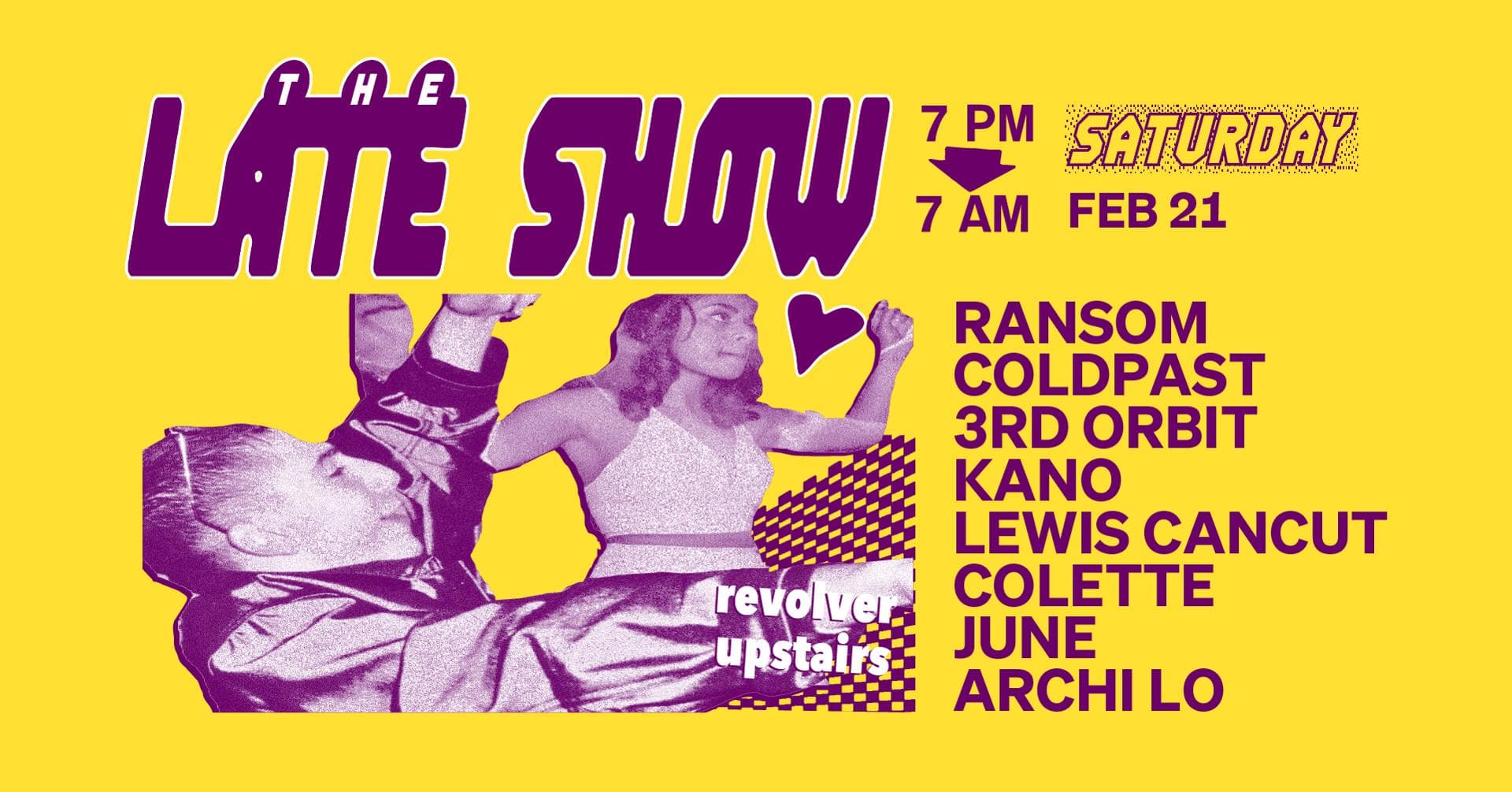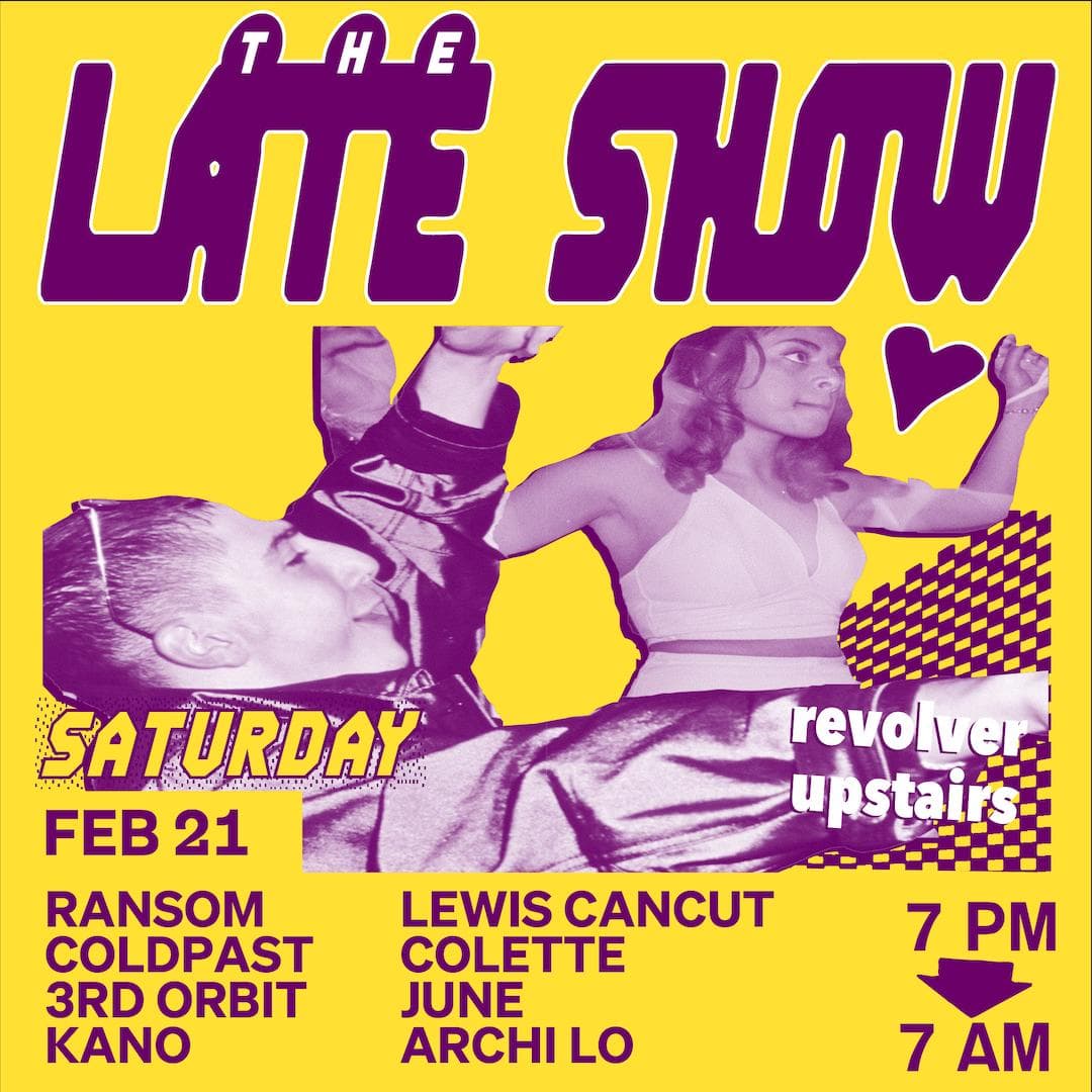 The Late Show is Revolver’s weekly Saturday night. Spread over two rooms, the night begins with Colonel Tan’s restaurant, then gathers pace around 10pm. In the front room, a barrage of Garage, Bassline, Techno and Qgom is shelled down; while in the back-bar, DJ’s splice together House with layers of Italo, Soca and Afro. Residents Ransom, Lewis CanCut and guests plus Boogs from 7am Sunday.