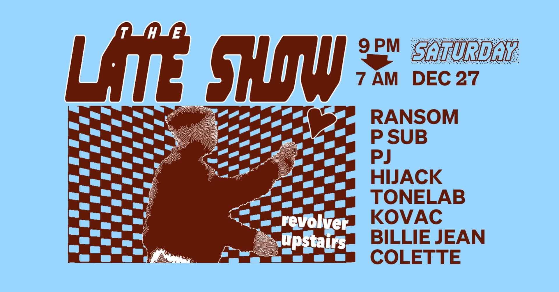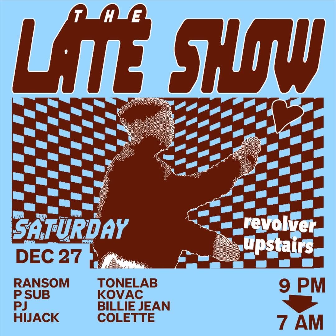 The Late Show is Revolver’s weekly Saturday night. Spread over two rooms, the night begins with Colonel Tan’s restaurant, then gathers pace around 10pm. In the front room, a barrage of Garage, Bassline, Techno and Qgom is shelled down; while in the back-bar, DJ’s splice together House with layers of Italo, Soca and Afro. Residents Ransom, Lewis CanCut and guests plus Boogs from 7am Sunday.