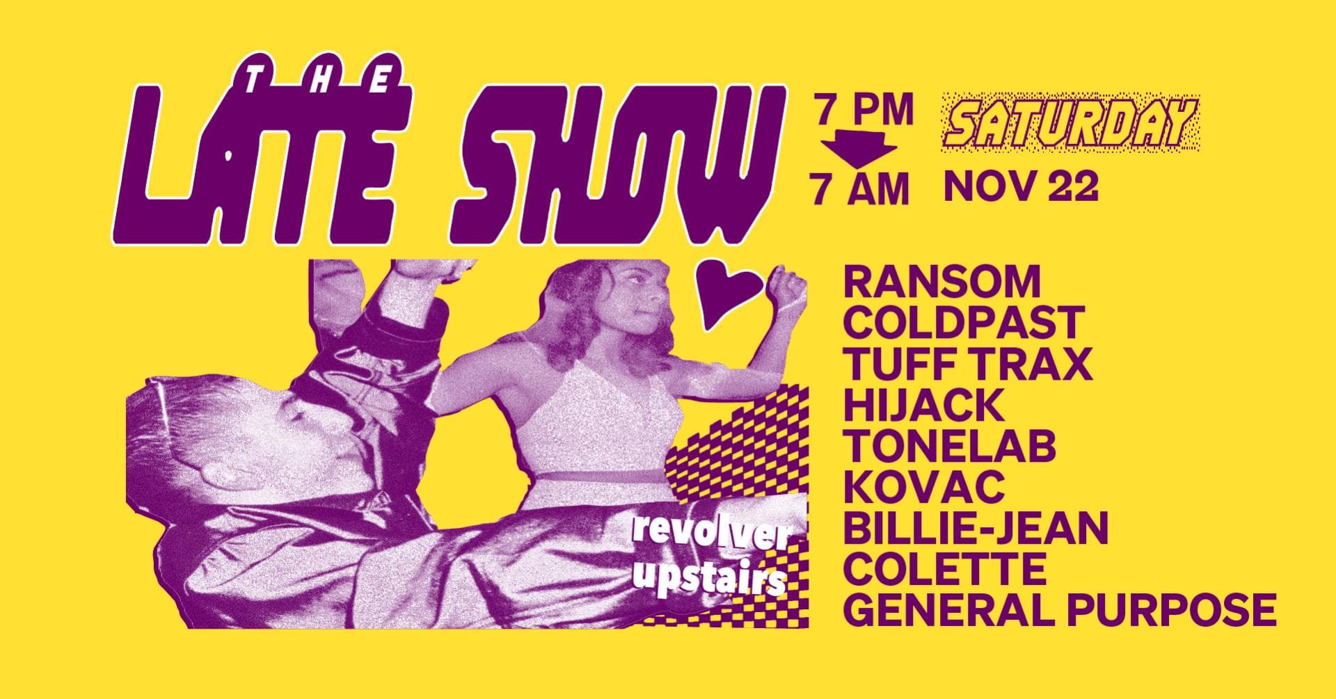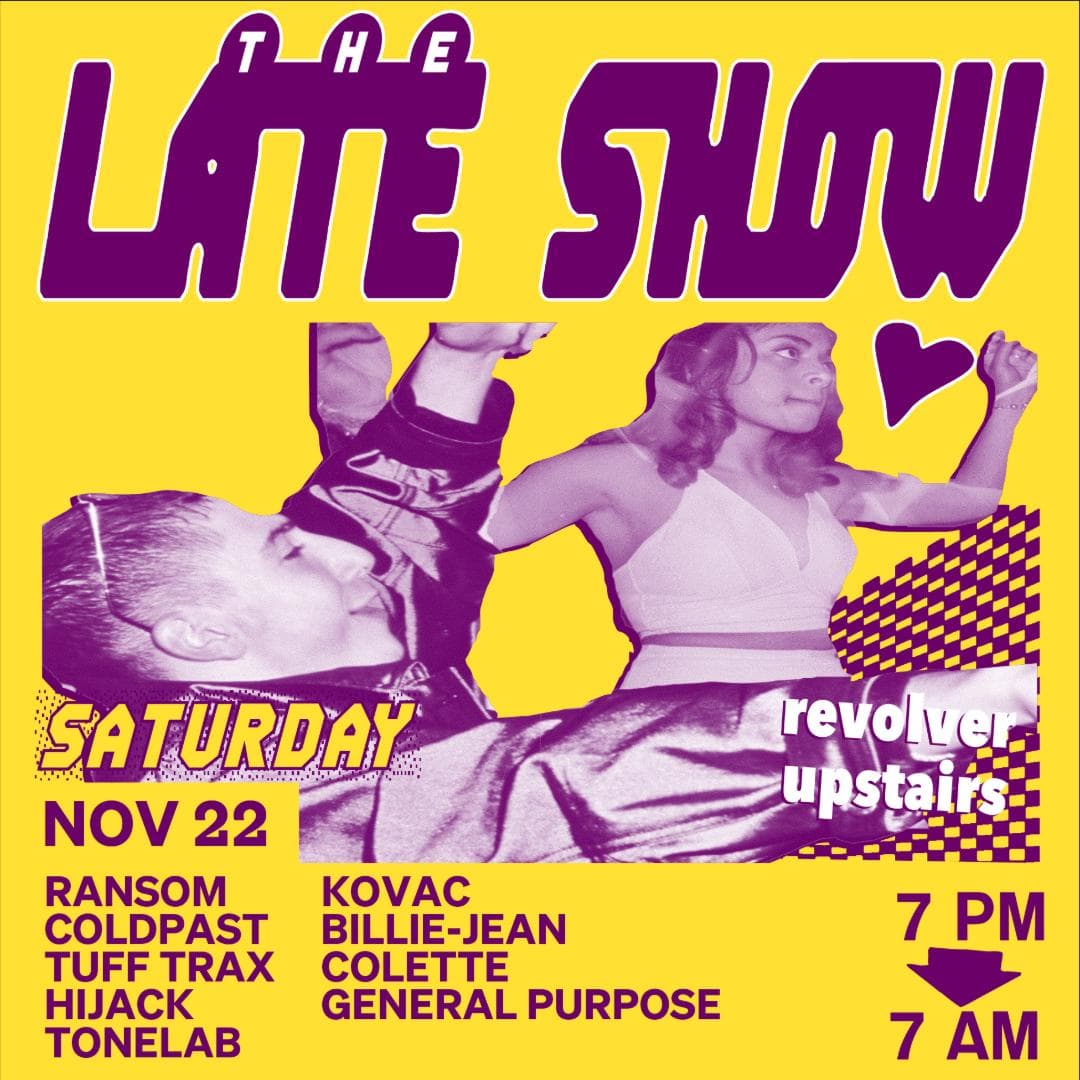 The Late Show is Revolver’s weekly Saturday night. Spread over two rooms, the night begins with Colonel Tan’s restaurant, then gathers pace around 10pm. In the front room, a barrage of Garage, Bassline, Techno and Qgom is shelled down; while in the back-bar, DJ’s splice together House with layers of Italo, Soca and Afro. Residents Ransom, Lewis CanCut and guests plus Boogs from 7am Sunday.