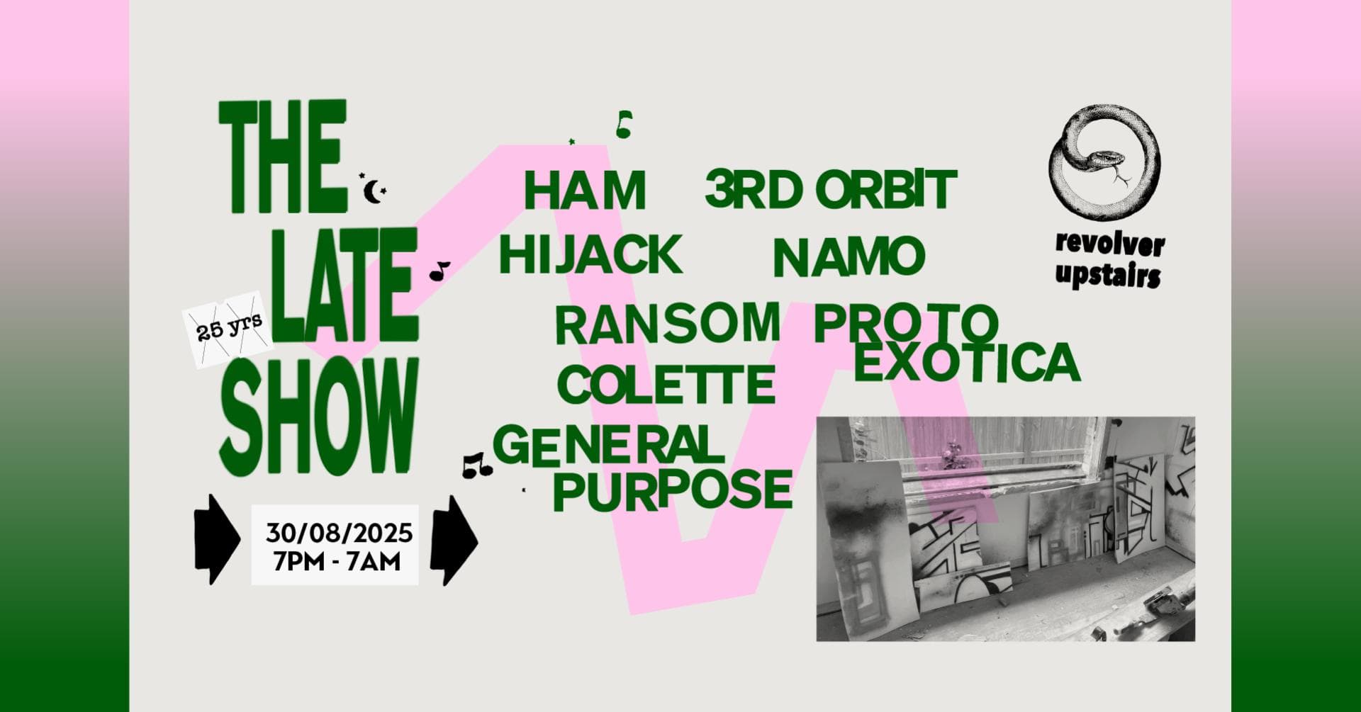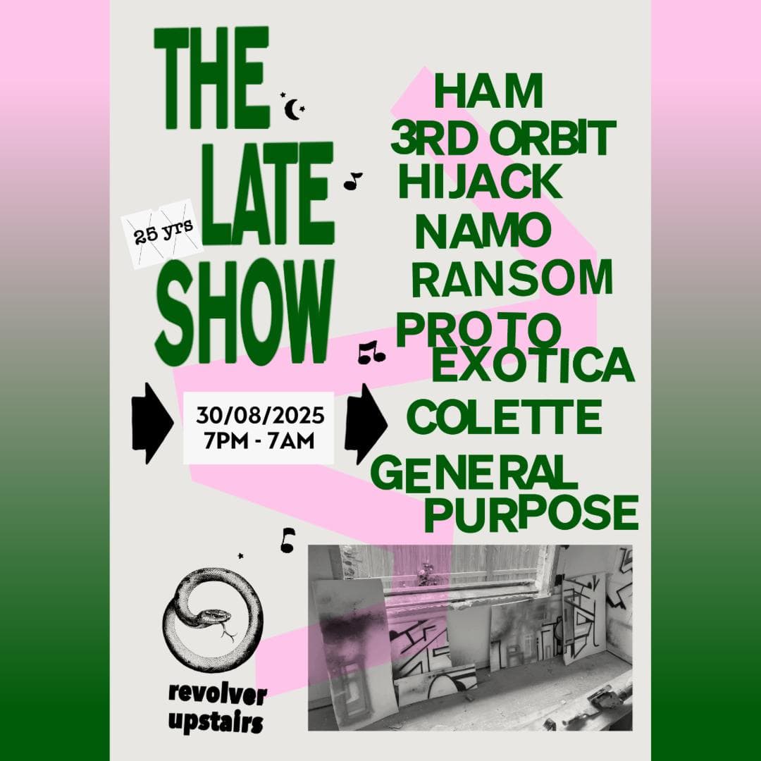 The Late Show is Revolver’s weekly Saturday night. Spread over two rooms, the night begins with Colonel Tan’s restaurant, then gathers pace around 10pm. In the front room, a barrage of Garage, Bassline, Techno and Qgom is shelled down; while in the back-bar, DJ’s splice together House with layers of Italo, Soca and Afro. Residents Ransom, Lewis CanCut and guests plus Boogs from 7am Sunday.