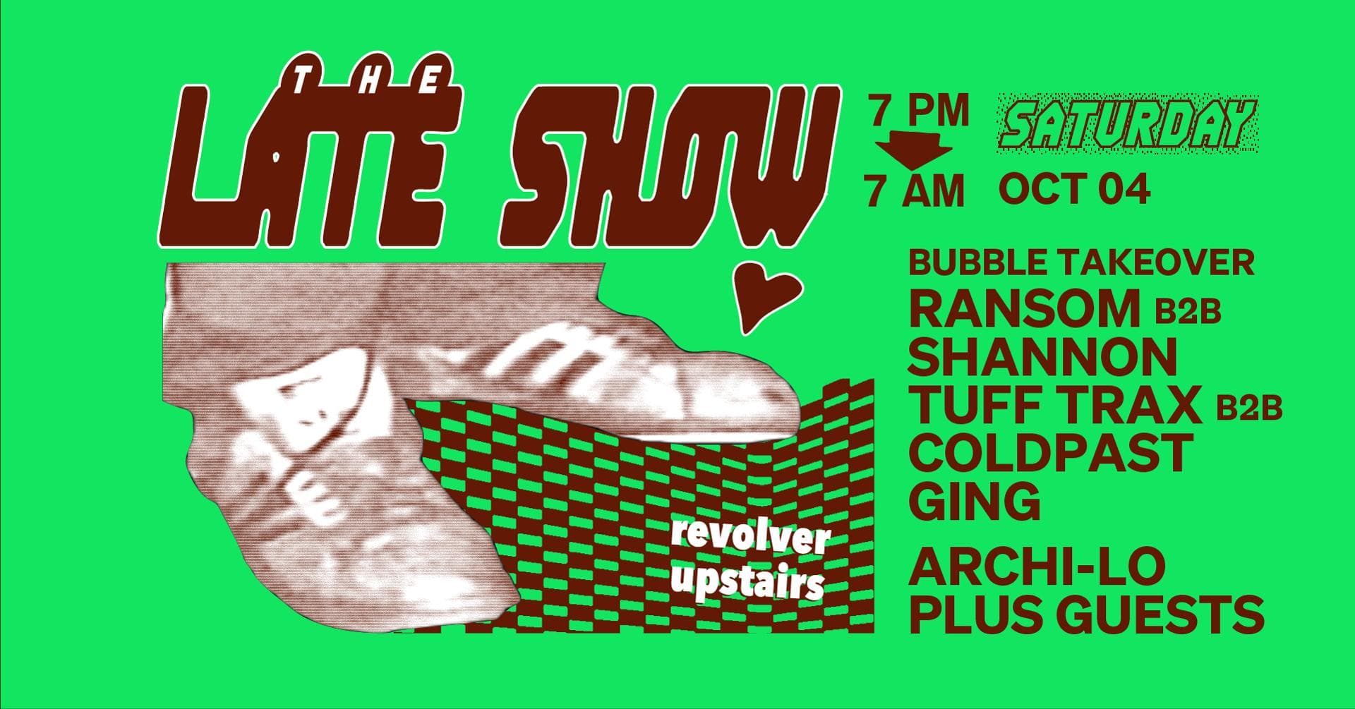 The Late Show is Revolver’s weekly Saturday night. Spread over two rooms, the night begins with Colonel Tan’s restaurant, then gathers pace around 10pm. In the front room, a barrage of Garage, Bassline, Techno and Qgom is shelled down; while in the back-bar, DJ’s splice together House with layers of Italo, Soca and Afro. Residents Ransom, Lewis CanCut and guests plus Boogs from 7am Sunday.