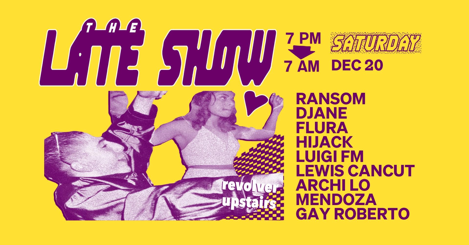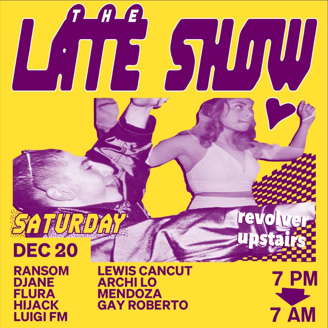 The Late Show is Revolver’s weekly Saturday night. Spread over two rooms, the night begins with Colonel Tan’s restaurant, then gathers pace around 10pm. In the front room, a barrage of Garage, Bassline, Techno and Qgom is shelled down; while in the back-bar, DJ’s splice together House with layers of Italo, Soca and Afro. Residents Ransom, Lewis CanCut and guests plus Boogs from 7am Sunday.