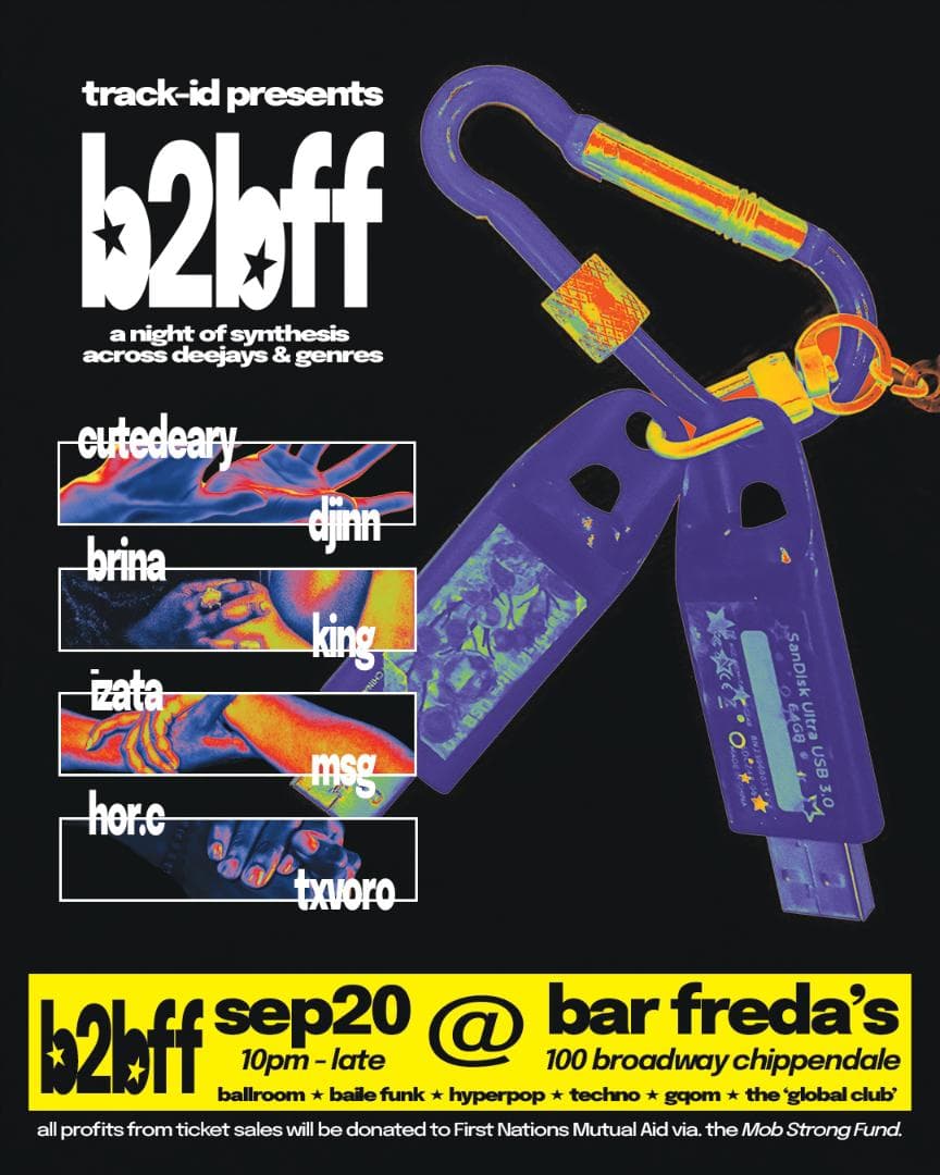 Expect a synthesis across genres, from ballroom to baile funk, hyperpop to techno, gqom to jersey, and beyond. The b2bff lineup unites DJs who are shaping the underground right now, dedicated to their craft, versatile, and on the rise. At its heart, TRACK-ID centres QPOC voices and celebrates the queer and POC communities that move our dance floors: