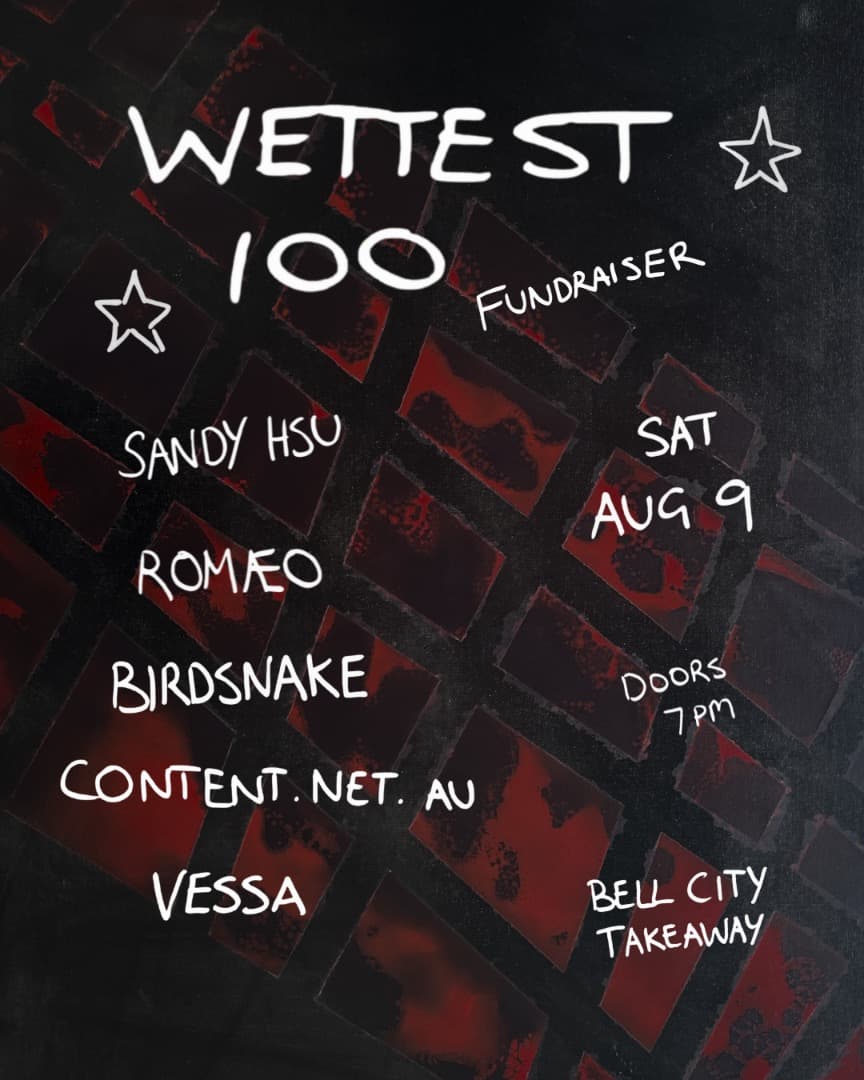 The Wettest 100 is an alternative, fan-voted top 100 countdown celebrating left-field music from so-called Australia. With our main sponsor no longer able to support us, all profits from this event will go directly towards restructuring and funding The Wettest 100 to make it a sustainable longterm staple in the local alternative scene.
