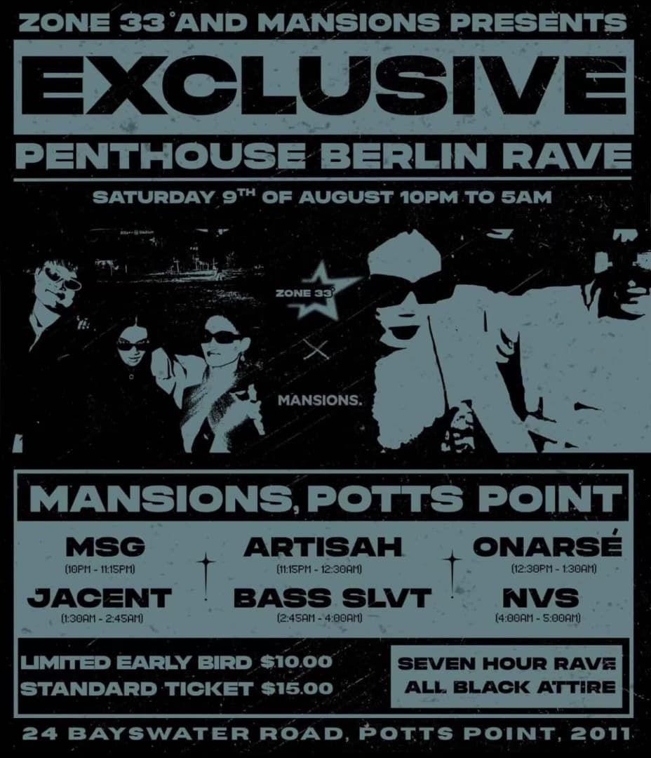7 hours of Hard Techno tunes, curated by Sydney's best upcoming DJs. It's okay if you want to miss out, not everyone can handle attending a ZONE 33° rave. Be sure to wear ALL BLACK attire!